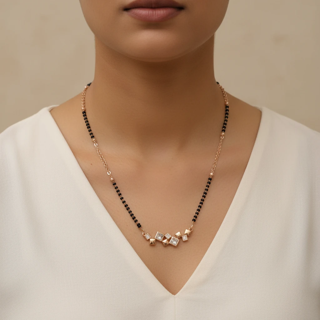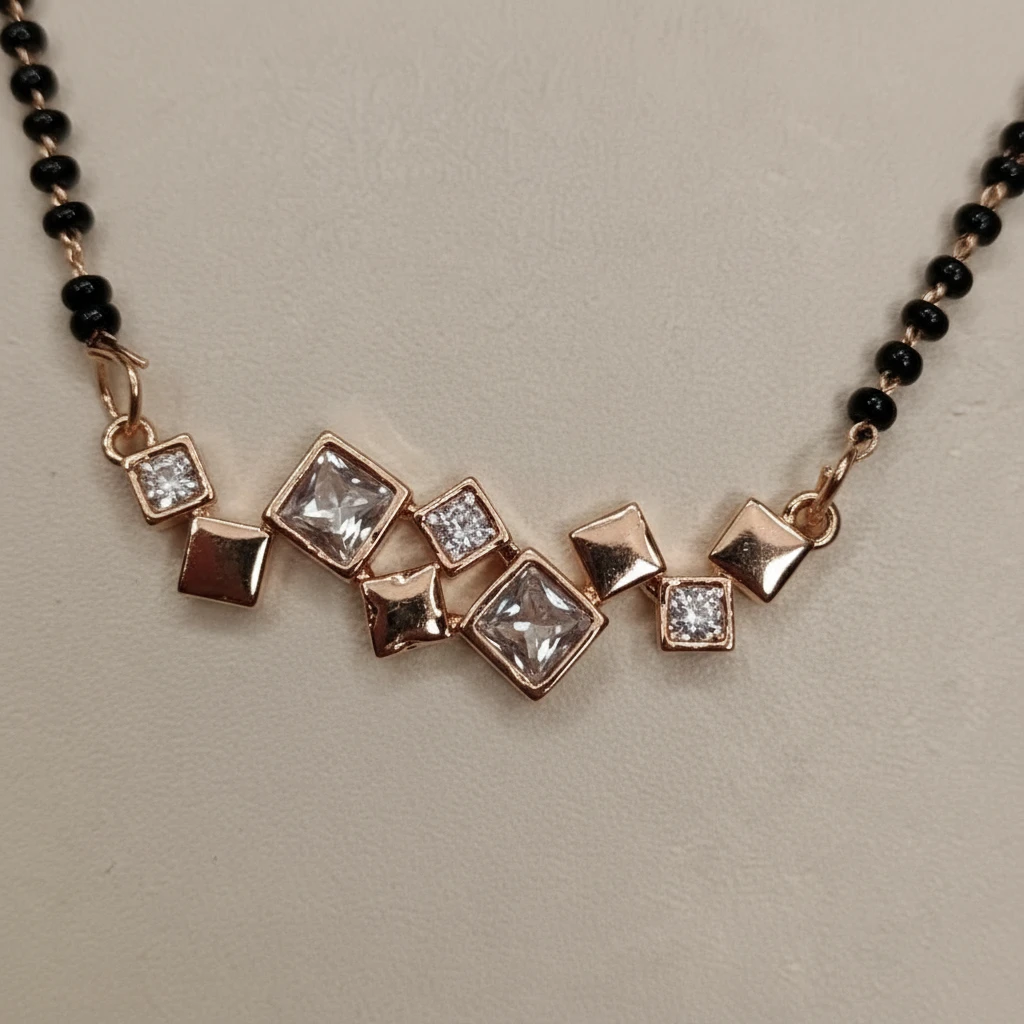 The highlight of this mangalsutra is its trendy geometric pendant design featuring a mix of shapes adorned with sparkling AD diamonds, creating a bold yet elegant look. The design stands out while still being minimal enough for everyday wear.