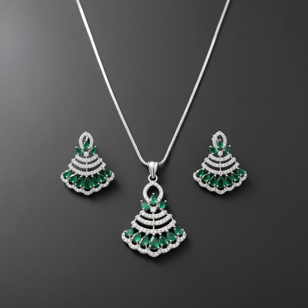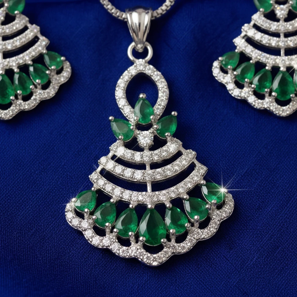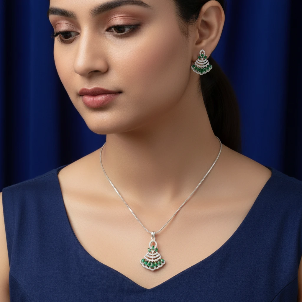 Add a touch of elegance with this emerald green AD stone pendant set, designed for modern women. Lightweight, stylish, and perfect for daily wear, office wear, and college looks.