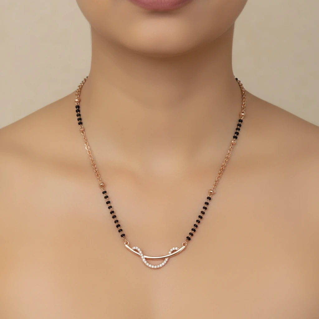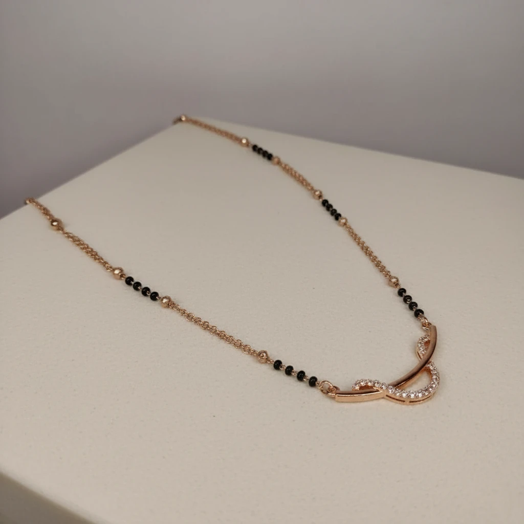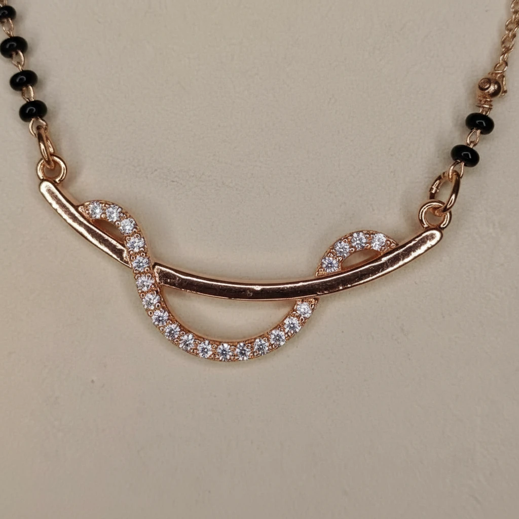 The highlight of this mangalsutra is its unique curved pendant design studded with sparkling AD diamonds, giving it a sleek and modern appearance. The fine chain with classic black beads adds a traditional element while keeping the overall look minimal and elegant.