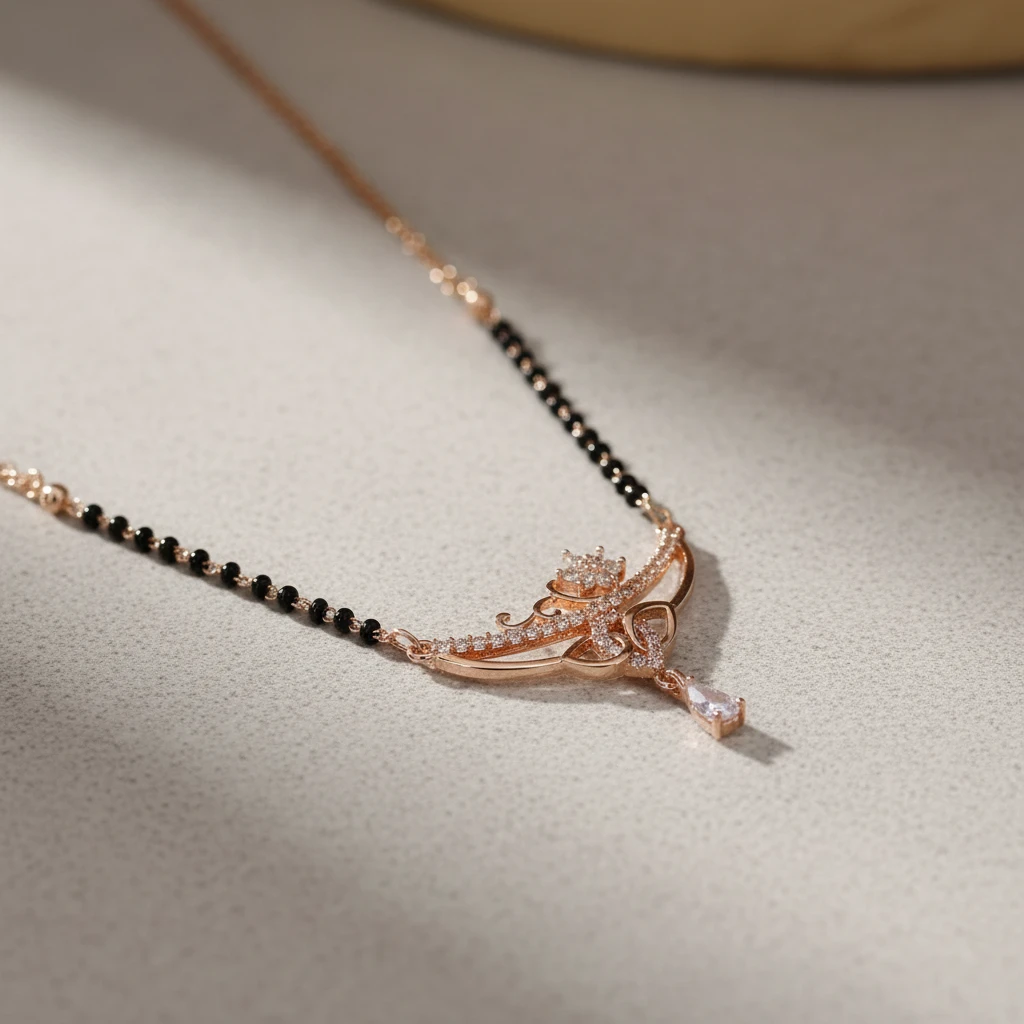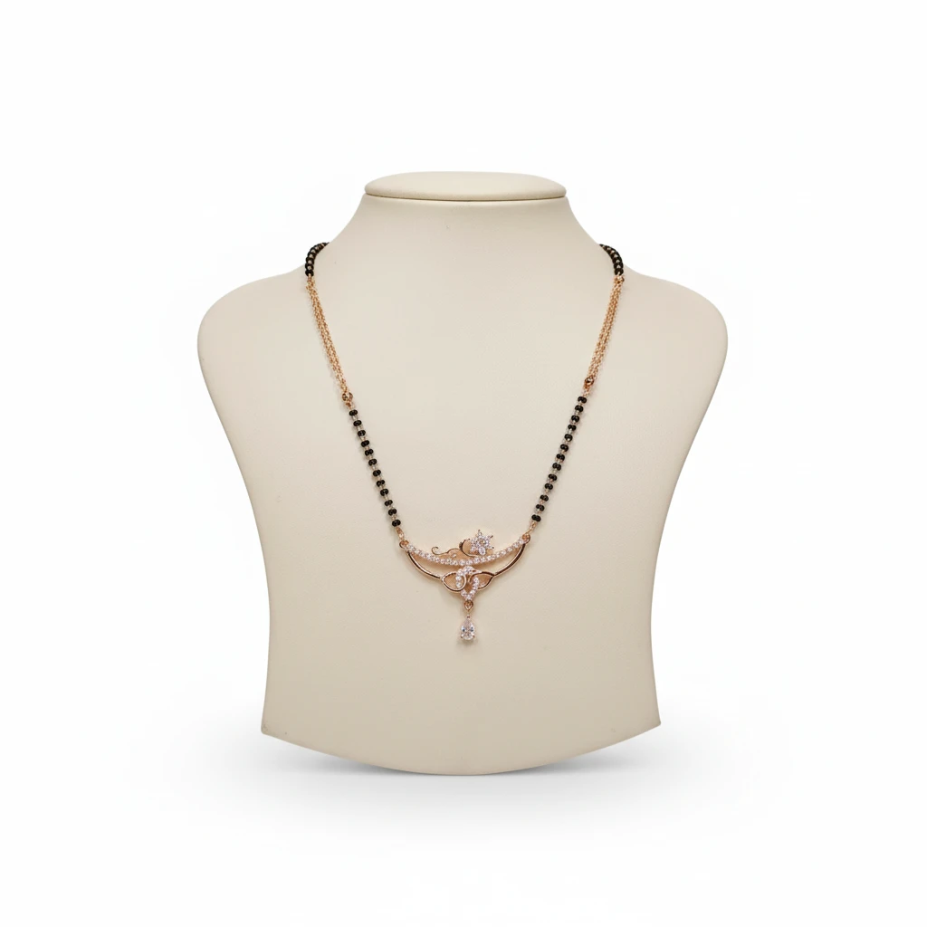 The pendant features a graceful traditional-inspired design with sparkling AD diamonds and a delicate drop detail, giving it a soft and elegant finish. The classic black bead chain maintains the essence of a traditional mangalsutra, while the modern styling makes it suitable for daily wear.
